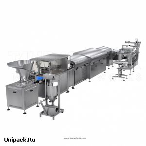 Линия «ЛГС 6000» предназначена для производства творожных глазированных сырков различной формы, с начинкой или без нее. На линии производят глазированные сырки весом 35-50 г. Для упаковки глазированных сырков на горизонтальном упаковочном автомате устанавливается многослойная пленка с полноцветным рисунком (по типу конфет "MARS").