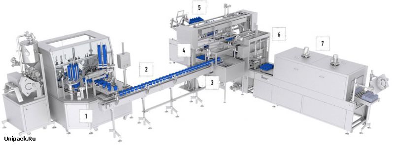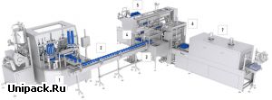 Линия осуществляет полностью автоматическую фасовку жидких и полувязких молочных продуктов (сметана, йогурт и т.п.) в готовую пластиковую тару (стаканчик) с запайкой фольгой и укупоркой крышкой-нахлобучкой, дальнейшее транспортирование, группировку в блоки и перенос блоков в сформированный картонный трей.