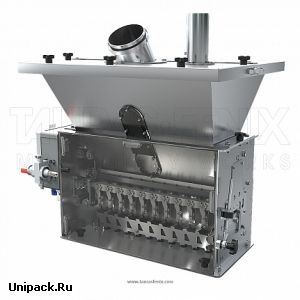 Кивательное движение мерок происходит с помощью пневматических цилиндров. Установка объема доз осуществляется совместно для всех мерок сразу. Стандартный набор мерок дозатора - максимум одной дозы 10 мл. Объем бункера дозатора 10 литров, бункер изготовлен из нержавеющей стали. Дозатор спроектирован для легкой очистки без использования инструментов. Дозатор изготовлен из нержавеющей стали AISI 304.