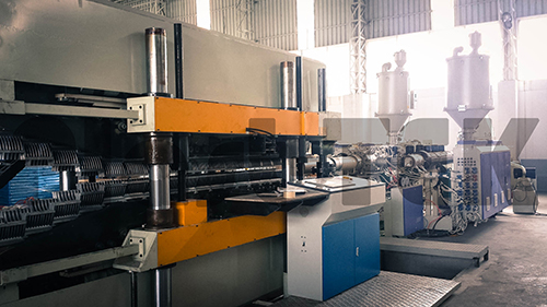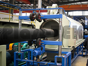 Экструзионная линия для производства двустенных гофрированных труб из HDPE, диаметром:160 мм.-600 мм. Диаметры изготавливаемых труб: 160 мм., 200 мм., 250 мм., 300 мм., 400 мм., 500 мм. 600 мм. Скорость экструзии: 0,05-2 м/мин., в зависимости от диаметра и используемого сырья. Максимальная производительность:400-800 кг/час. Производственная мощность изменяется в зависимости от материалов и условий эксплуатации.