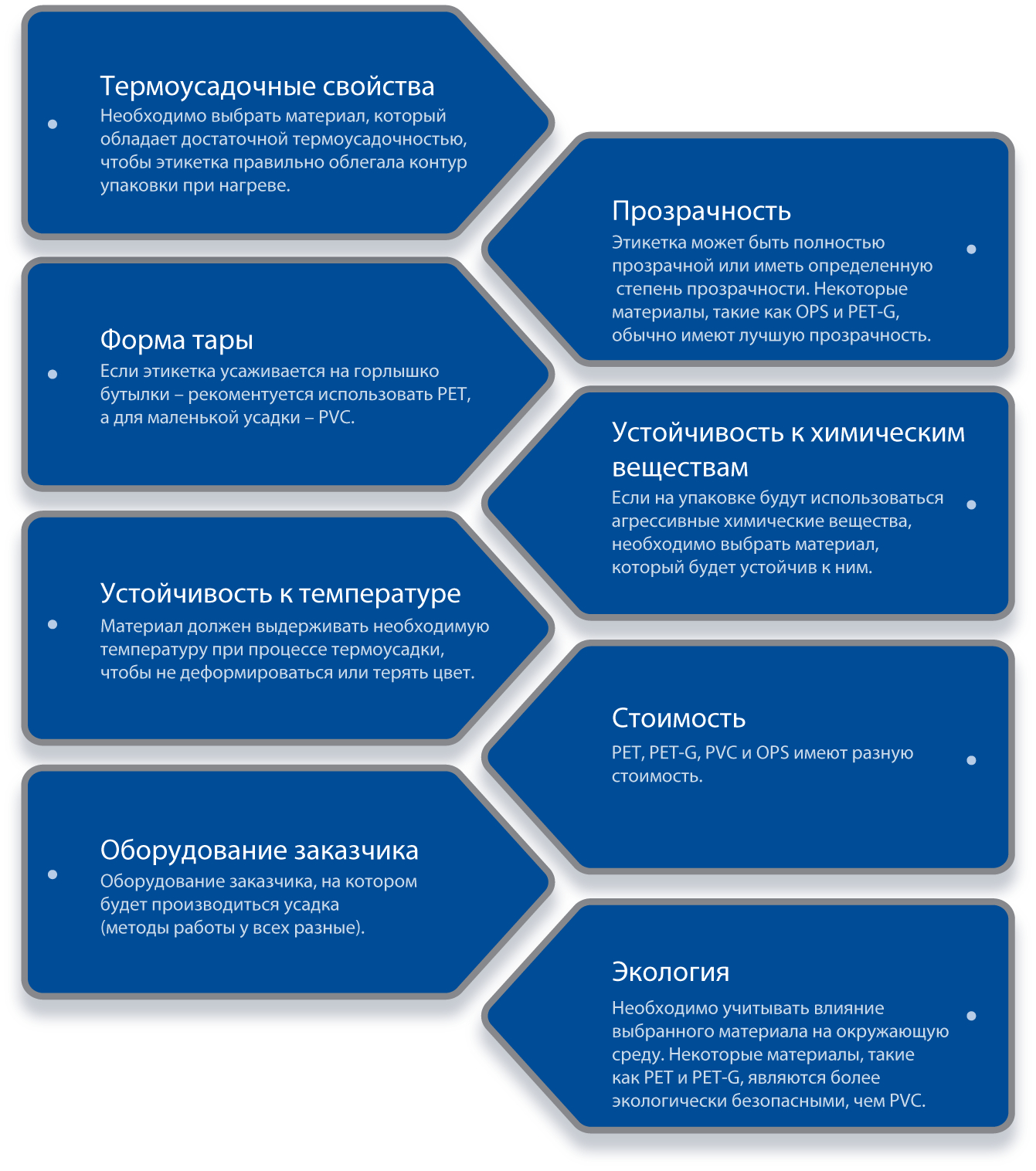 Термоусадочные этикетки в большинстве случаев печатаются на таких материалах, как PET (полиэтилентерефталат), PET-G (гликолизированный полиэтилентерефталат), PVC (поливинилхлорид) и OPS (ориентированный полистирол). Сотрудники компании Печатный Экспресс — Флексография при оформлении заказа обязательно учитывают следующие критерии: