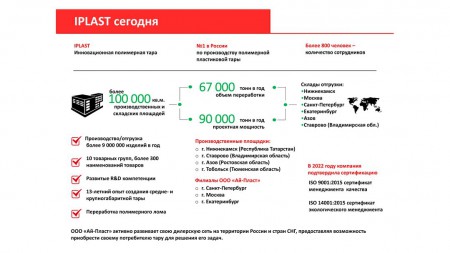 Компания «Ай-Пласт» (iPlast) - крупнейший российский производитель крупногабаритной тары и мусорных контейнеров для ТБО. Производственные мощности включают литьевые машины, экструзионные линии, оборудование по вакуумформованию.