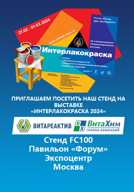 Группа компаний «ВитаХим» совместно с компанией «ВитаРеактив» (стенд FC100, павильон «Форум») примут участие в международной специализированной выставке химического сырья для производства ЛКМ и промышленных покрытий, которая будет проходить в Москве с 27 февраля по 1 марта 2024 г. в ЦВК «Экспоцентр».