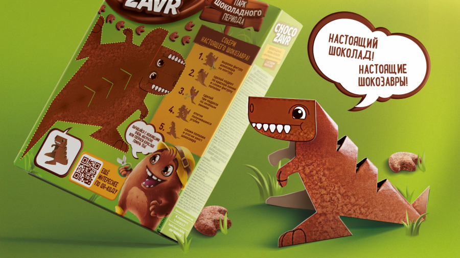 В агентстве не ограничились только вкусными фудгруппами и героями — для каждого продукта продумали игровую механику, которая раскрывает идею каждого SKU. Например в «Парке шоколадного периода» можно вырезать, сложить и собрать прямо из коробки настоящего динозавра.