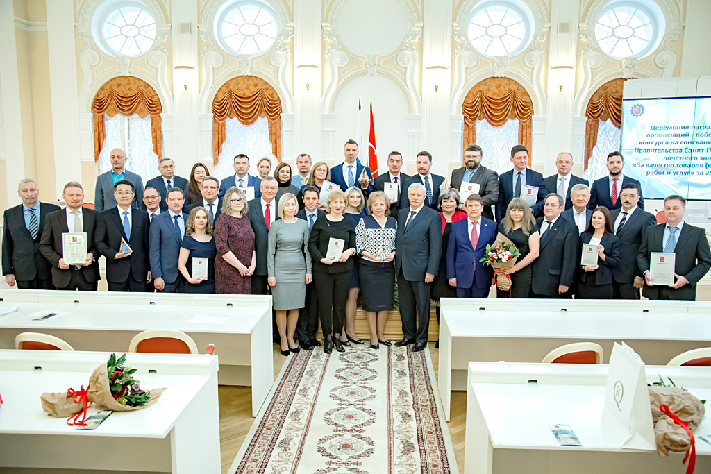 Награда правительства СПб – почетный знак «За качество товаров (продукции), работ и услуг» присуждается по итогам конкурса и является формой признания особых заслуг петербургских предприятий и организаций за достижение высокого качества продукции, выполнения работ и оказания услуг, обеспечение их безопасности, внедрение высокоэффективных методов менеджмента качества организации.