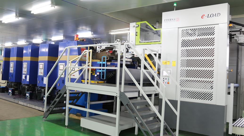 Новая автоматическая линия e-Line от компании ETERNA представляет собой плосковысекательный пресс с полным набором периферийного оборудования: автопитатель, разделитель заготовок и палетайзер.