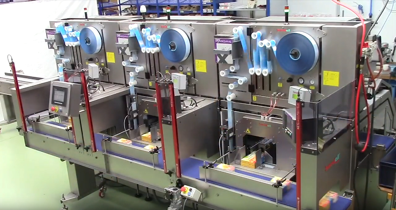 Поток продукции с конвейерной ленты разделяется на 3 участка, собирается в пачки по 2 упаковки, обандероливается с помощью промо-ленты, и готовая продукция поступает на выводной конвейер для последующей упаковки.