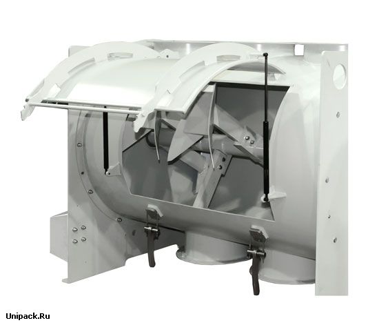 Пневматический привод управляет затвором выгрузного патрубка смесителя, расположенным снизу.