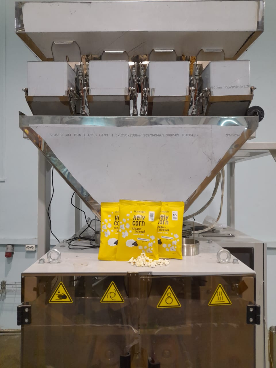 Специалистами компании «Русская Трапеза» закончена сборка и испытания упаковочного автомата РТ-УМ 26 с ДВМ 41 для упаковки попкорна.