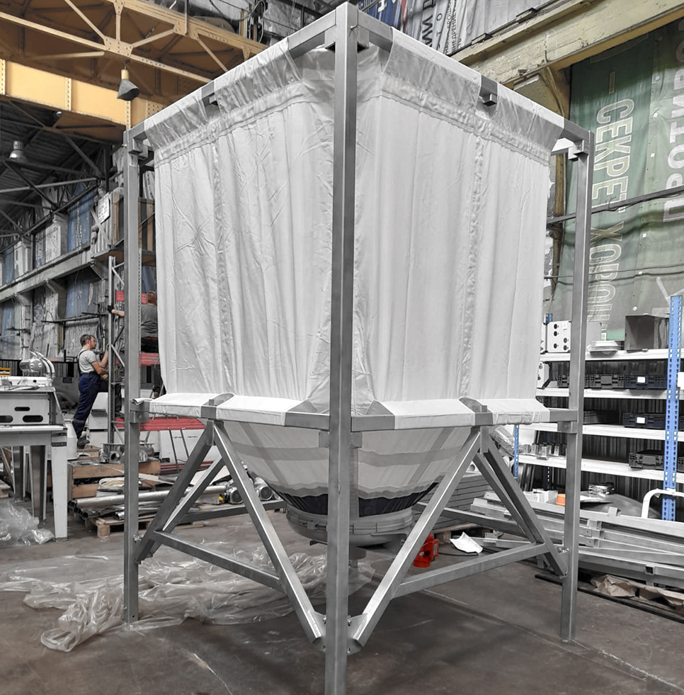На производстве машиностроительного завода «Русская Трапеза» началась сборка комплекса БХМ. Один из компонентов комплекса - тканевый силос с виброднищем.