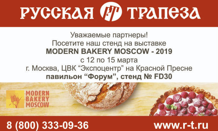 12-15 марта холдинг "Русская Трапеза" примет участие в выставке Modern Bakery Moscow 2019, на котором ведущие специалисты холдинга представят наиболее востребованное оборудование компании.