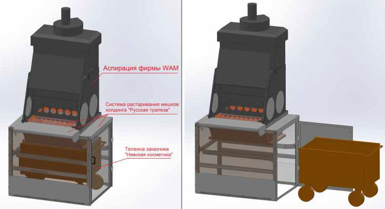 В декабре 2018 года конструкторы холдинга «Русская Трапеза», по запросу заказчика, разработали специальную систему растаривания мешков в собственную тележку предприятия. Основной задачей разработчиков являлось полное исключение просыпа и распыла продукта в процессе его растаривания. Главная сложность проекта заключалась в высокой степени пыления и сыпучести растариваемого сырья.