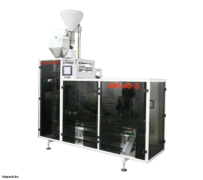 Автомат формирования брикета АФБ60-3S (брикетер) представляет собой горизонтальную машину формирования брикетов карусельного типа с цепным транспортером, приводимым сервоприводом. Пакеты с продуктом поступают в формовую ячейку и затем, последовательно, на различных позициях карусели происходит: виброуплотнение продукта в пакете, формирование верха пакета, сварка верхнего шва, отрезка и удаление излишка пленки, двойное (180°+90°) сгибание верха пакета и фиксация уложенного верха («затвора») самоклеющейся этикеткой.