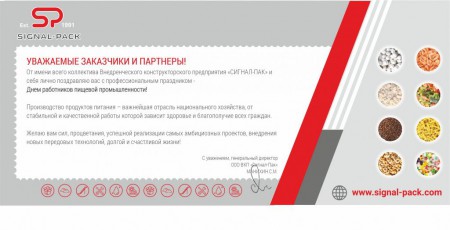 ВКП «СИГНАЛ-ПАК» поздравляет всех работников и представителей пищевой промышленности, а также своих партнеров и заказчиков с профессиональным праздником.