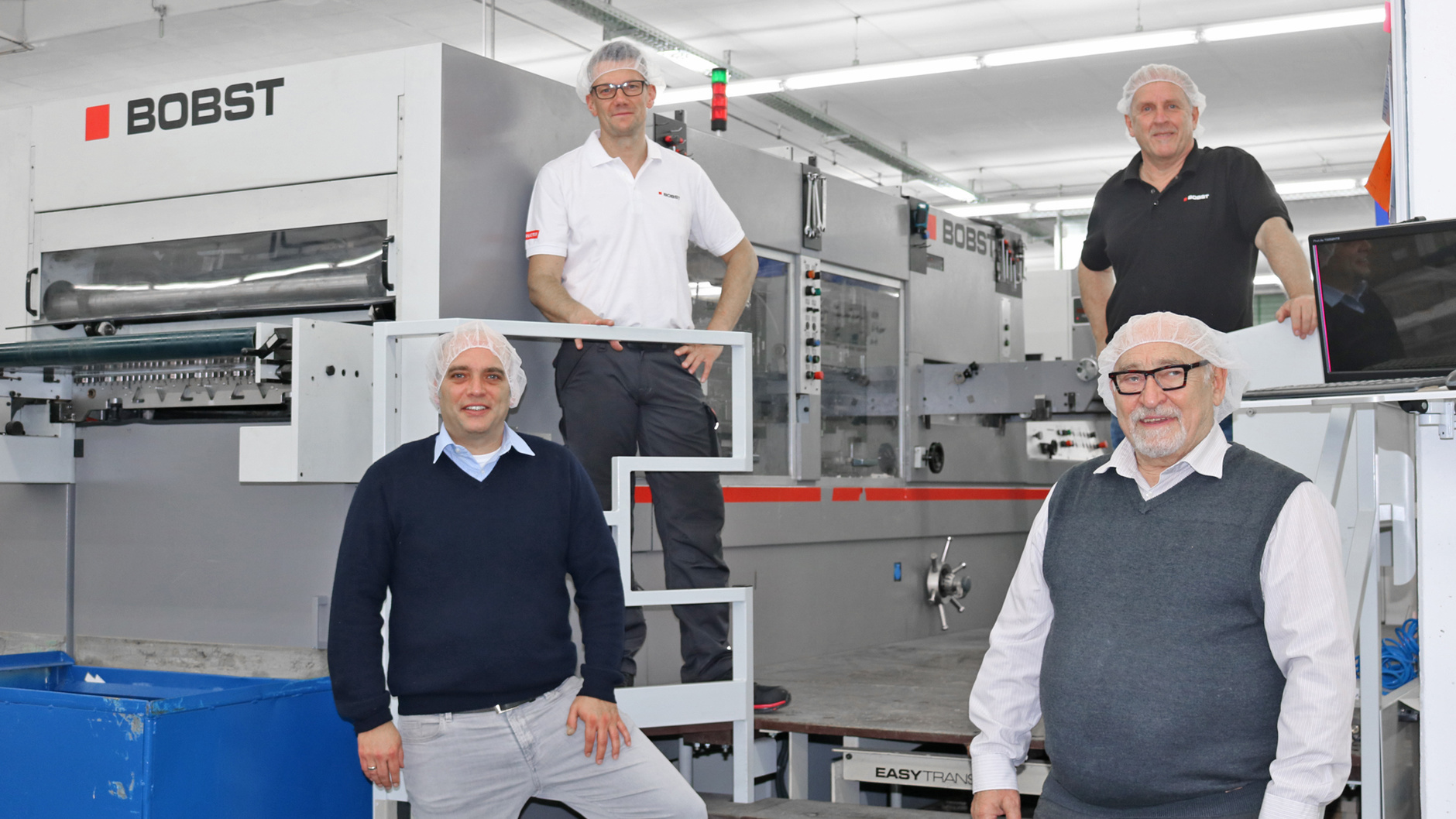 Команда, которая совместно спланировала и внедрила процесс модернизации в компании Spiegel Verpackungen: Генеральный директор Мартин Шпигель (внизу справа), Управляющий директор Майкл Шпигель (внизу слева), Манфред Вонинг, ответственный за процесс модернизации, инструктор демо-центра Бобст Меербуш (сверху справа), и Томас Ноймейстер, Технологический специалист Бобст Меербуш (сверху слева)