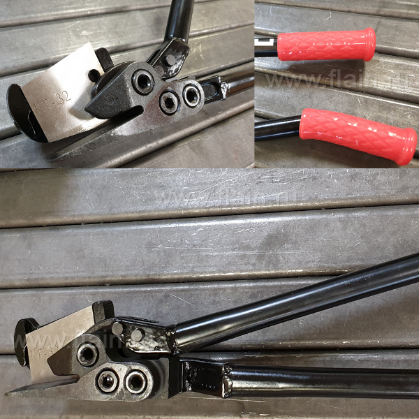 Ширина разрезаемой ленты: до 50 мм. Ножницы имеют удобные ручки длинной 600 мм, что облегчает резку металлической ленты. Вес ножниц КТ-32 составляет 3,15 кг.