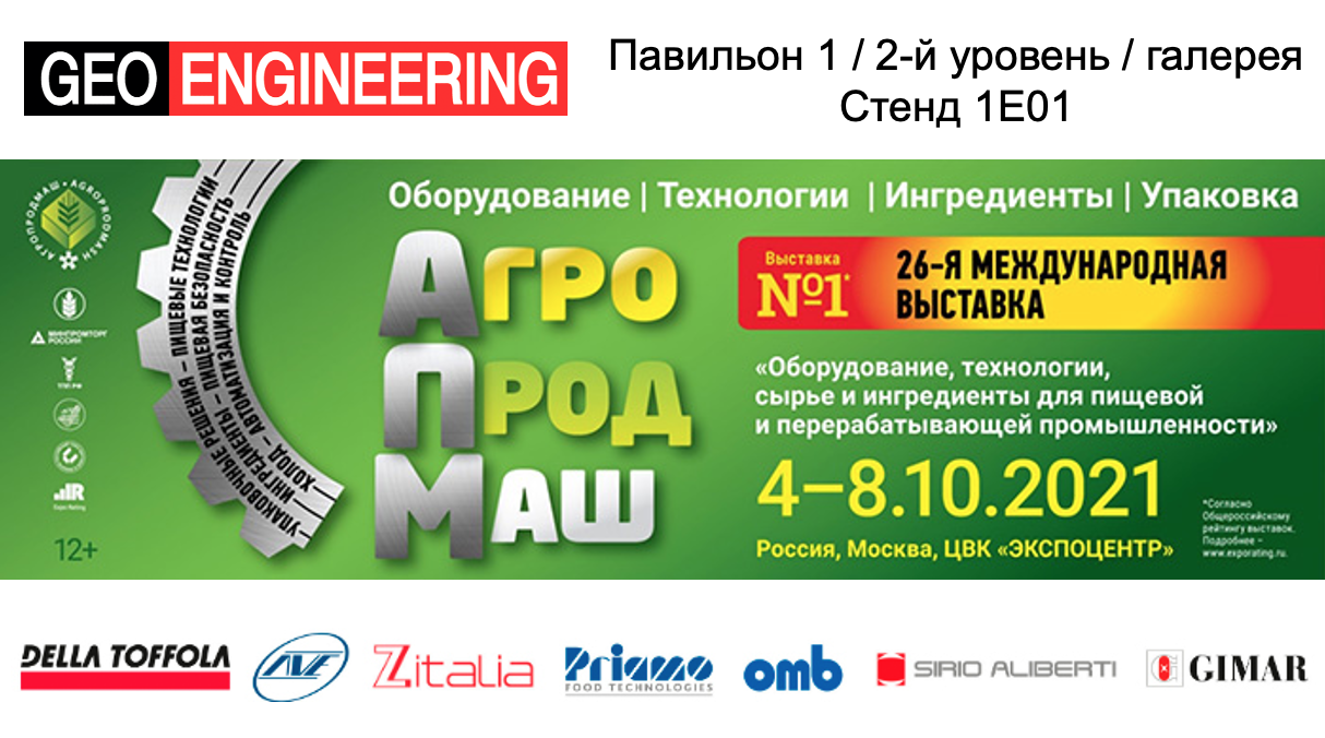 Компания GEO-ENGINEERING вместе со своим итальянским партнером AVE TECHNOLOGIES (Della Toffola Group) примут участие в международной выставке «Агропродмаш-2021», которая пройдет с 4 по 8 октября 2021 года в ЦВК «Экспоцентр».