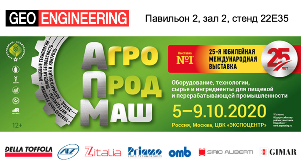 Компания GEO-ENGINEERING вместе со своим итальянским партнером AVE TECHNOLOGIES (Della Toffola Group) приглашает посетить свой стенд (павильон 2, зал 2, стенд 22E35) на юбилейной 25-й международной выставке «Агропродмаш-2020», которая пройдет в ЦВК «Экспоцентр» с 5 по 9 октября 2020 г.