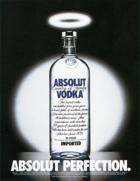 Параллельно с рыночными успехами Absolut уделил невиданное до тех пор среди производителей спиртного внимание рекламе. В 1980 году было положено начало знаменитой рекламной серии Absolut, длящейся по сей день. С тех пор реклама водки Absolut представляет собой остроумные вариации на одну и ту же тему: изображение бутылки и под ним надпись, состоящая из двух или трех слов, первое из которых всегда Absolut. Первая реклама этой серии Absolut Perfection ("Абсолют Совершенство") стала канонической и вошла во все учебники рекламного мастерства. Кстати, постоянным партнером Absolut по рекламной активности было и остается нью-йоркское агентство TBWA.