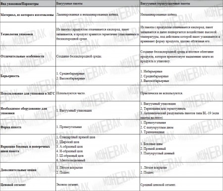 Таблица сравнения вакуумных и вакуумных термоусадочных пакетов для упаковки