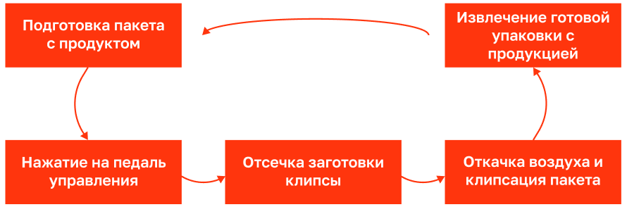 СХЕМА ТЕХНОЛОГИЧЕСКОГО ПРОЦЕССА УПАКОВКИ НА ПОЛУАВТОМАТИЧЕСКОМ КЛИПСАТОРЕ СМ-1.