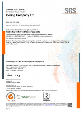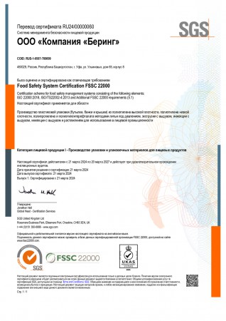 Компания «Беринг» успешно получила сертификат по Системе менеджмента безопасности пищевой продукции. Это подтверждает, что ООО «Компания «Беринг» полностью соответствует требованиям FSSC 22000.