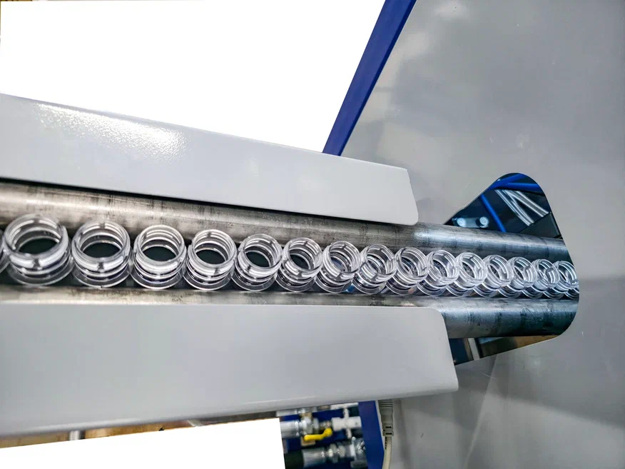 Давление выдува 25 бар вместо 16 бар позволило повысить качество выдуваемой тары и скорость работы. Причем качество остается стабильным для широкого диапазона объемов тары и веса используемой преформы. И даже при работе с недорогими преформами аппарат позволяет сохранять качество тары. При этом компрессорное оборудование доступно по цене: его стоимость значительно ниже, чем у аппаратов большего давления на 40 бар.