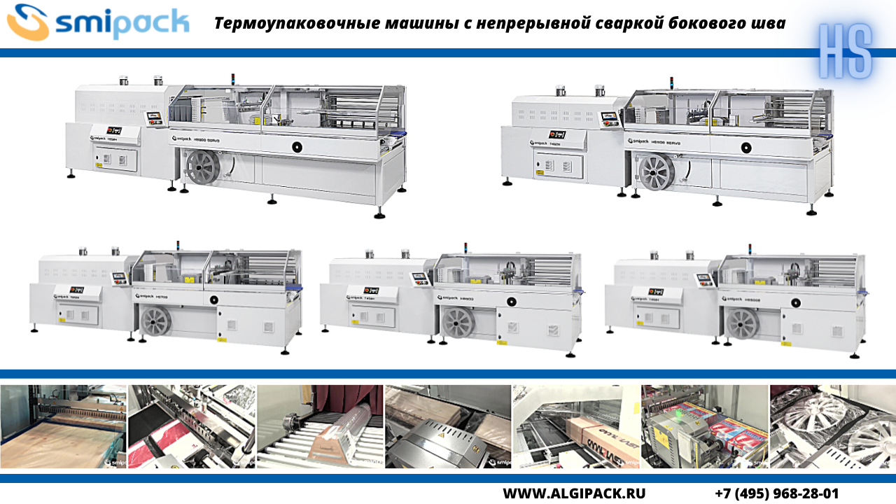 Продолжением линейки скоростных термоупаковочных машины в ассортименте Smipack выступают упаковочные машины циклического и непрерывного действия серии HS. Все эти машины Вы можете приобрести в компании Алджипак.