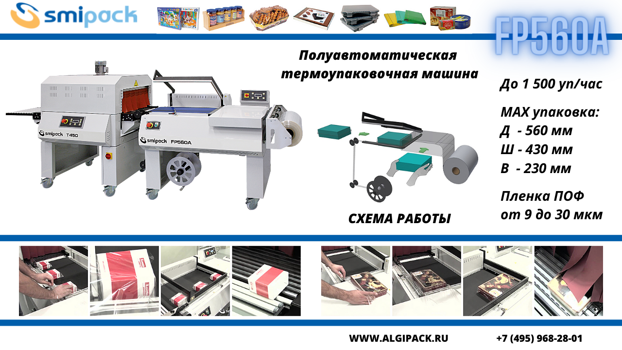 Знакомьтесь: полуавтоматическая термоупаковочная машина Smipack FP560A. Предназначена для штучной или групповой упаковки широкого ассортимента продукции в термоусадочную полиолефиновую (ПОФ) пленку.