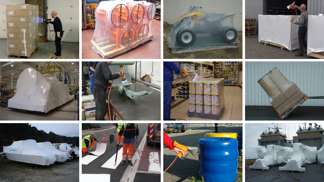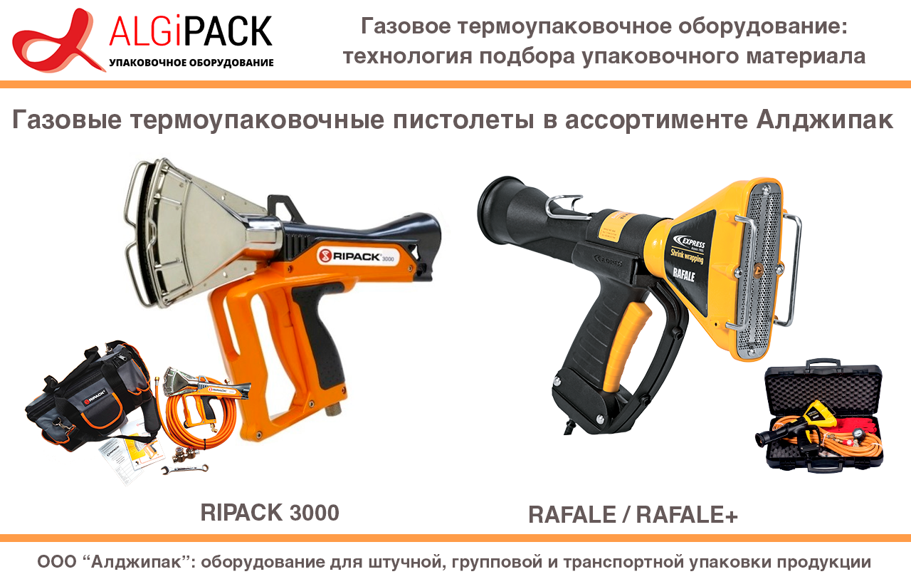 В этой статье мы расскажем Вам о практике подбора упаковочного материала при упаковке грузов на паллете в термоупаковочную полиэтиленовую пленку. Данный вид транспортной упаковки продукции занимает сегодня значительную долю рынка. Нагрев и усадка упаковочного материала производится ручным газовым термоупаковочными пистолетами. В ассортименте компании Алджипак Вы найдете газовые пистолеты ведущих французских производителей – компаний RIPACK SEFMAT и GUILBERT EXPRESS.