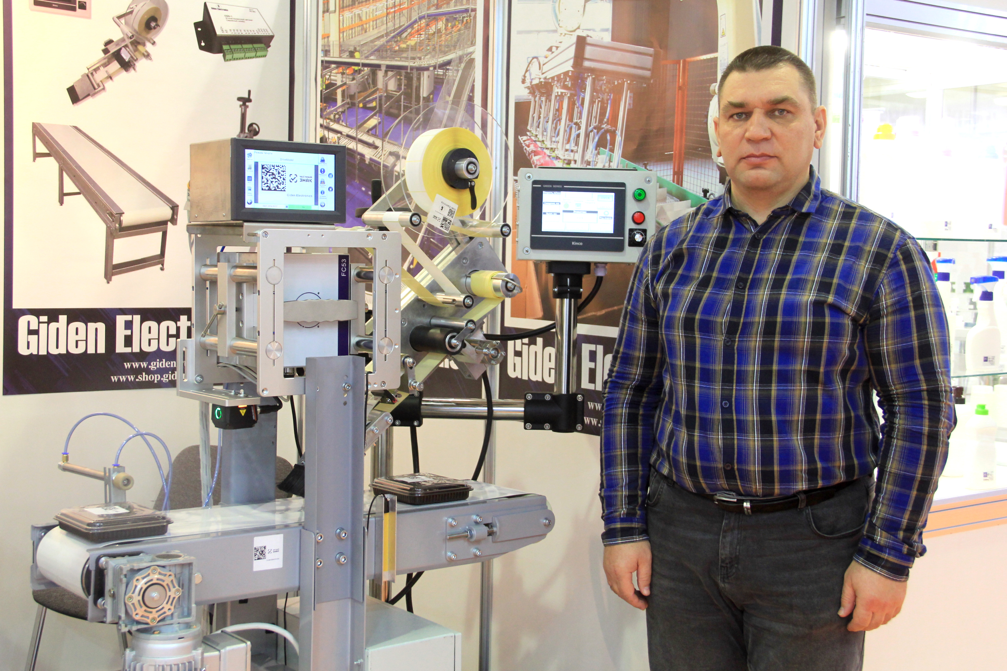 Представитель компании рассказал о работе представленного на стенде этикетировщика для наклеивания «Честного знака»: «Из программы на сайте скачиваются штрихкоды, которые печатаются принтером на этикетку. Затем этикетировщик их клеит, после чего камера их считывает. Происходит сравнение кодов. Если коды совпадают, тогда всё в порядке. Если же код не совпадает или происходит повтор кода, или он не считывается, тогда отбраковщик просто отбраковывает продукт. Всё продается по отдельности: этикетировщик, принтер, конвейер. Оборудование можно приобрести по частям, как конструктор».