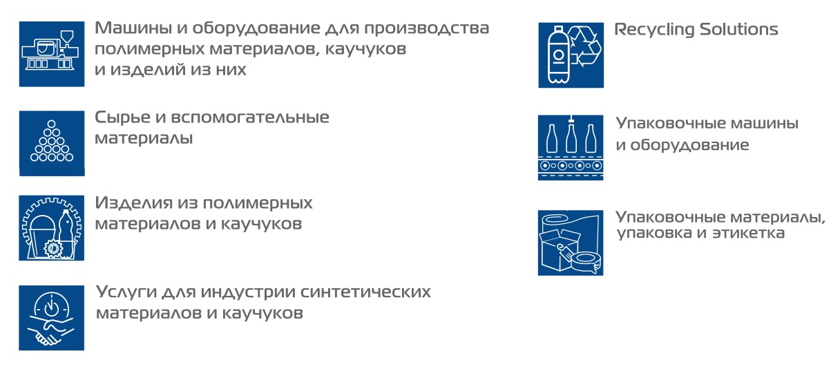 На одной площадке вы найдете комплексные решения под любые профессиональные запросы: от машин, оборудования и услуг для производства и переработки синтетических материалов, пластмасс и каучуков до готовых упаковочных решений, технологий печати и розлива, а также вторичной переработки и технологий защиты окружающей среды.