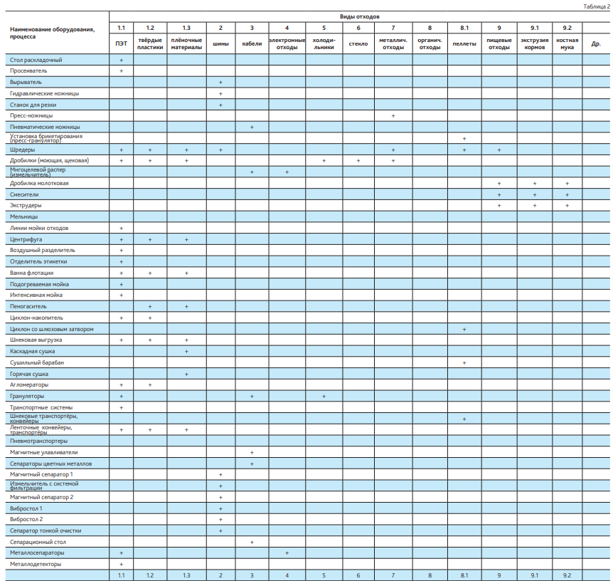 На выставке RUPLASTICA и RECYCLING SOLUTIONS традиционно представлены технологии и оборудование (линии) для переработки отходов (шредеры, дробилки, грануляторы, др.). Проведённый анализ показывает, что эти и другие виды технологий и оборудования могут применяться для переработки практически всех перечисленных видов отходов (таблица 2).