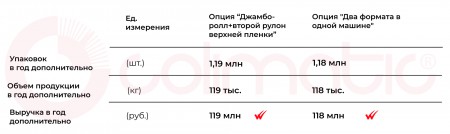 Добавление к джамбо-роллу опции «два рулона верхней плёнки в одной машине» позволяет предприятию экономить на сырье еще больше. Вместо одного верхнего рулона машина оснащается сразу двумя, которые возможно легко и быстро склеить между собой и продолжить работу, сократив тем самым время на заправку каждого нового рулона и затраты плёнки на брак. Термоформеры Colimatic при необходимости комплектуются сразу двумя этими опциями, что позволяет увеличить производительность линий и дополнительно паковать продукции в год на 119 миллионов рублей.