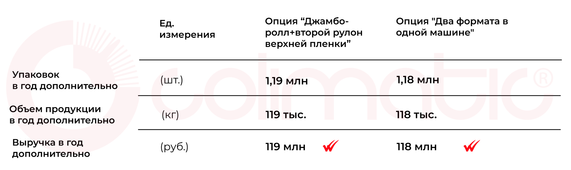 В таблице №1 представлены расчёты, основанные на данных предприятия из описанного нами кейса. В них наглядно демонстрируется, какой объём продукции в год можно дополнительно упаковать на термоформере Colimatic при установке интеллектуальных опций, а также рассчитано, какую дополнительную выручку в год можно получить благодаря оптимизации термоформовочной машины.