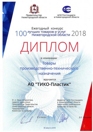 Значок «100 лучших товаров» по праву размещается на продукции ТИКО-Пластик. Диплом победителя конкурса и выход компании на федеральный этап - это подтверждение успешной работы предприятия и высокого качества производимых товаров.