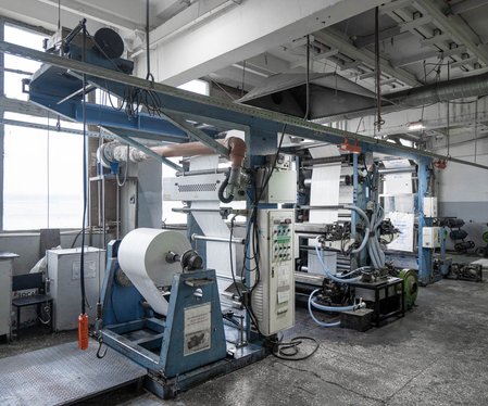 Рулон полипропиленовой ткани после круглоткацкого станка устанавливается на печатную машину стекового типа и рисунок наносится при перемотке рулона