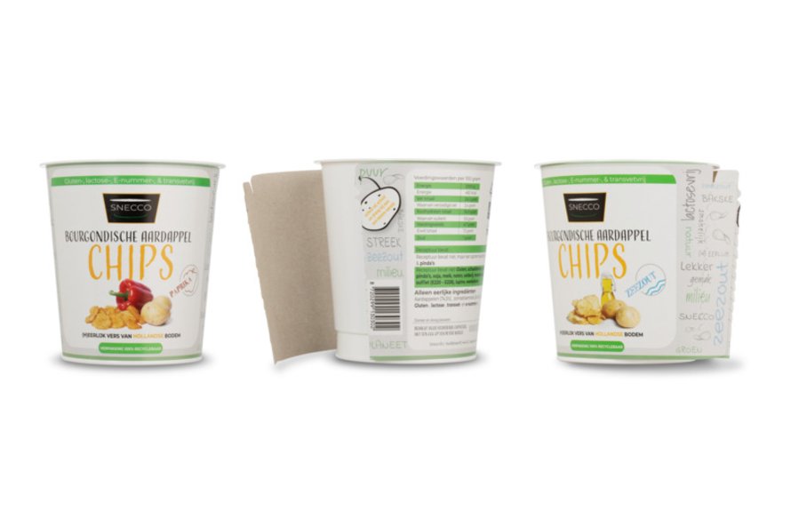 Картонный рукав, обёрнутый вокруг пластикового стакана, обеспечивает стаканчику привлекательный дизайн и возможности печати, позволяя поместить графику и другую информацию на упаковку. Этот рукав можно снять после использования и вернуть обратно в цикл вторичной переработки бумаги, при этом пластиковый стаканчик и крышка окажутся в цикле переработки пластика. Это чрезвычайно экологичное решение – в отличие от обычных пакетов для чипсов, которые состоят из ламината (пластиковой плёнки и алюминиевой фольги) и обычно отправляются на термическую переработку. В качестве альтернативы, большой стакан также является идеальным контейнером для хранения остатков продуктов.