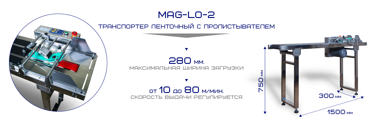 Транспортер ленточный с пролистывателем MAG-LO-2 представляет собой прямой транспортёр с областью массовой загрузки плоской продукции (коробки в сложенном виде, пакеты бумажные или полимерные, открытки, конверты и прочее) с поштучной выдачей продукции на транспортер, с возможностью последующего нанесения печати с помощью каплеструйных принтеров или наклеивания этикеток при помощи этикетировщиков.