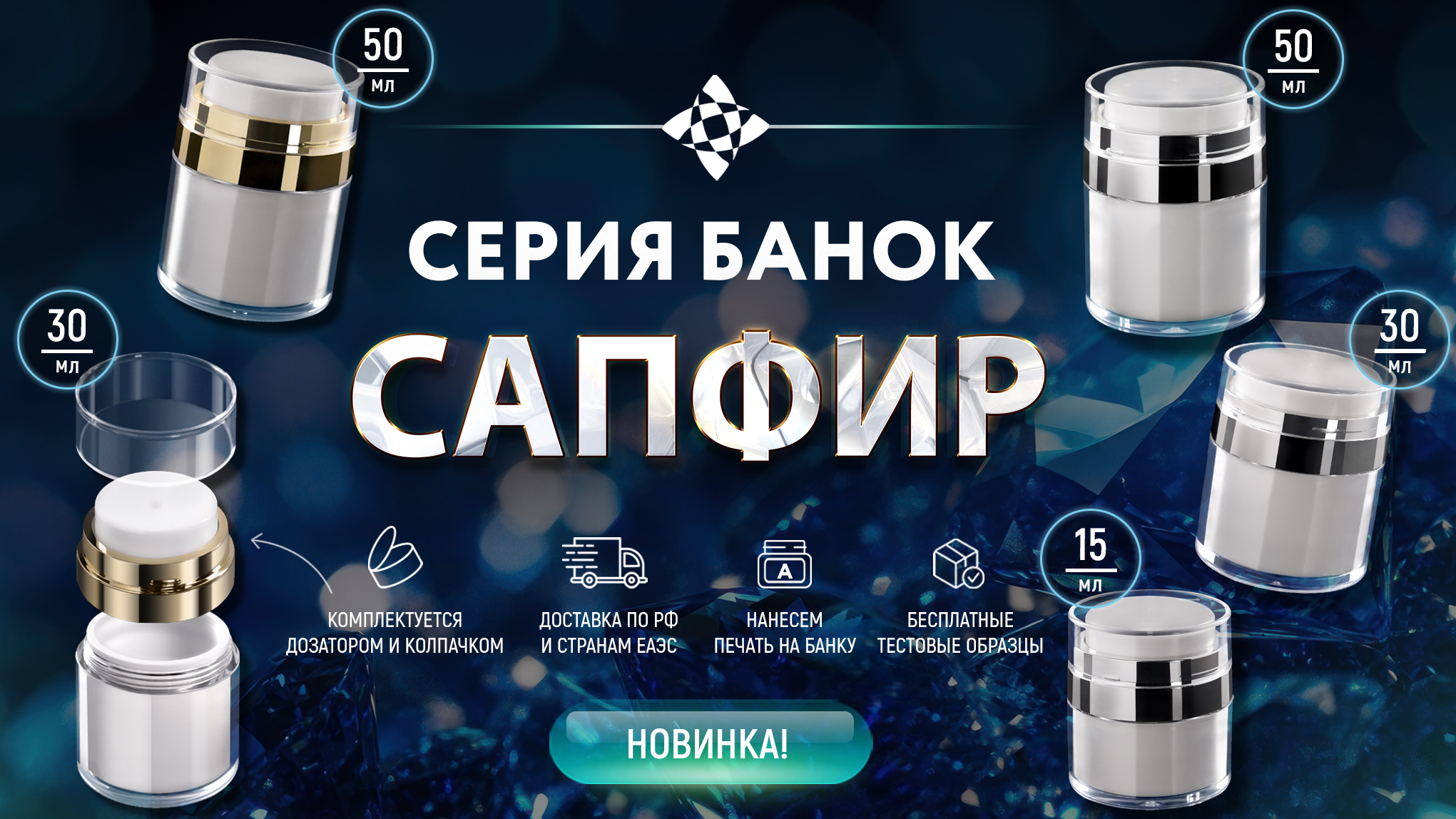 «Меридиан» представляет серию банок «Сапфир», которая идеально подходит для косметических средств, таких как: крем, тональная основа, крем для рук.