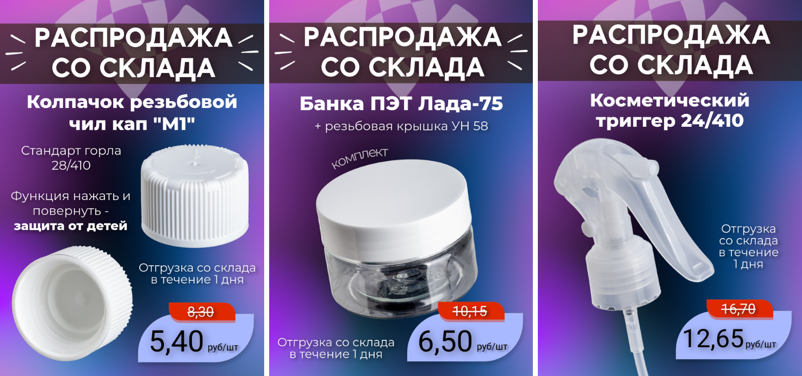 В акции представлены готовые комплекты упаковки, а также флаконы, банки, распылители, дозаторы, пипетки, колпачки и крышки. Это отличная возможность пополнить запасы качественной тары для вашего бизнеса по выгодным ценам.